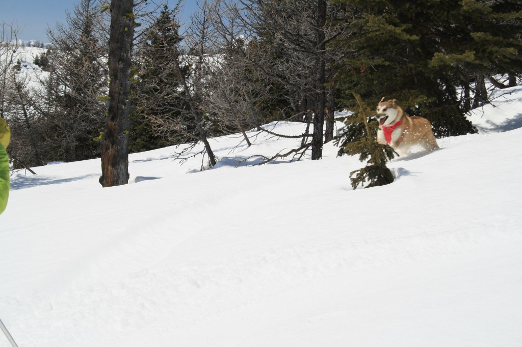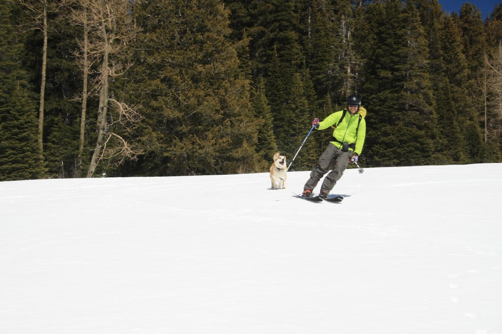 Now, pick a small objective to try first. You will want to see how your dog handles this and when they are just learning, there will be a learning curve. Buffy’s first few times out, she was too excited on the way up. She would wonder on an off the skin track, playing in the snow. She quickly smartened up though and learned to conserve her energy for the intense down hill sections. Make sure to watch your dog carefully and make sure they are following your line and understanding the game. Most dogs will get this right away, it’s fun, the humans are finally fast!