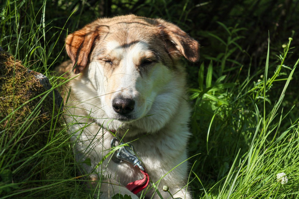 Buffy, laying peacefully in long grass, enjoying the sun on her face, at one of our campsites years ago.